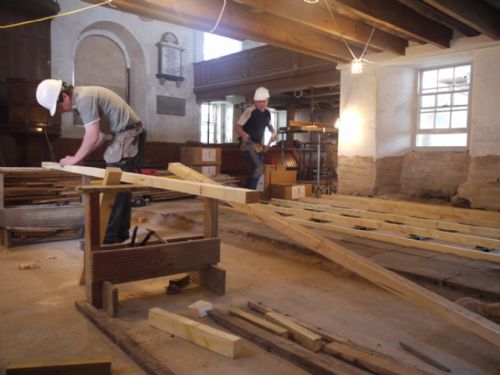 Inside the church David Alston told the children about the work to put the church back together - flagstone jigsaws, and timber framing that is being made by Graham and Christoph for the old floorboards to rest on.